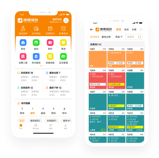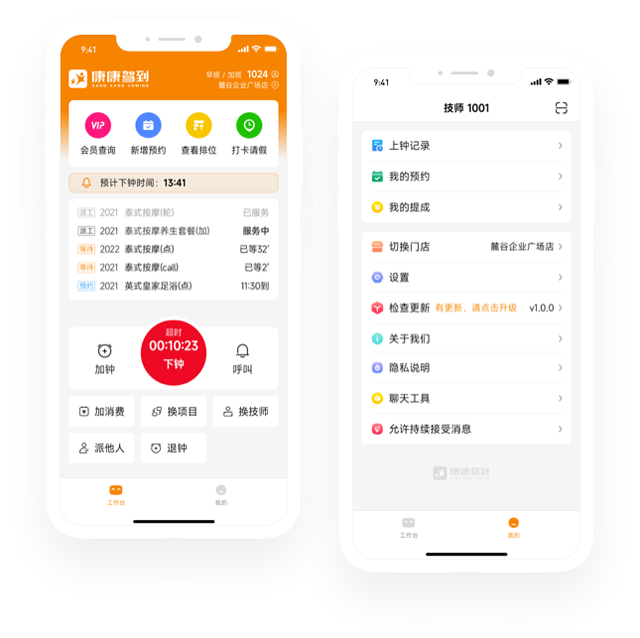 供技师使用,在手机上操作报钟、下钟、加钟等。