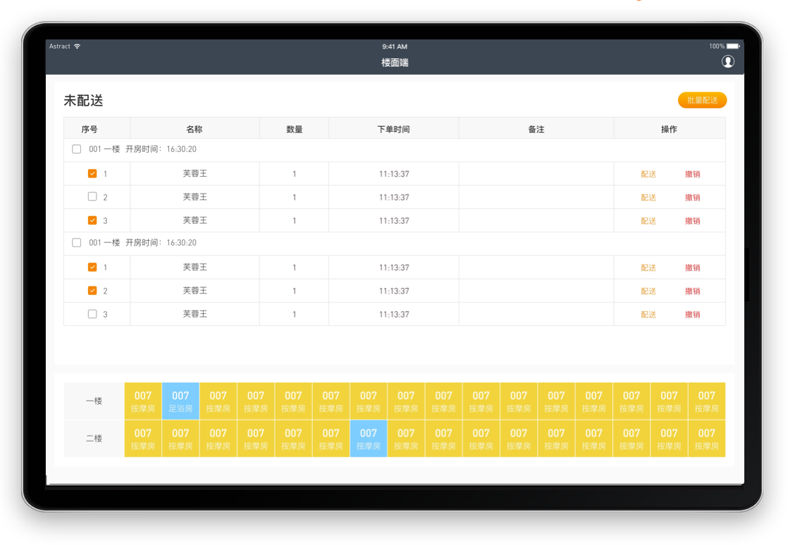 供服务员使用,在水吧平板电脑上进行商品、茶水的配送操作。