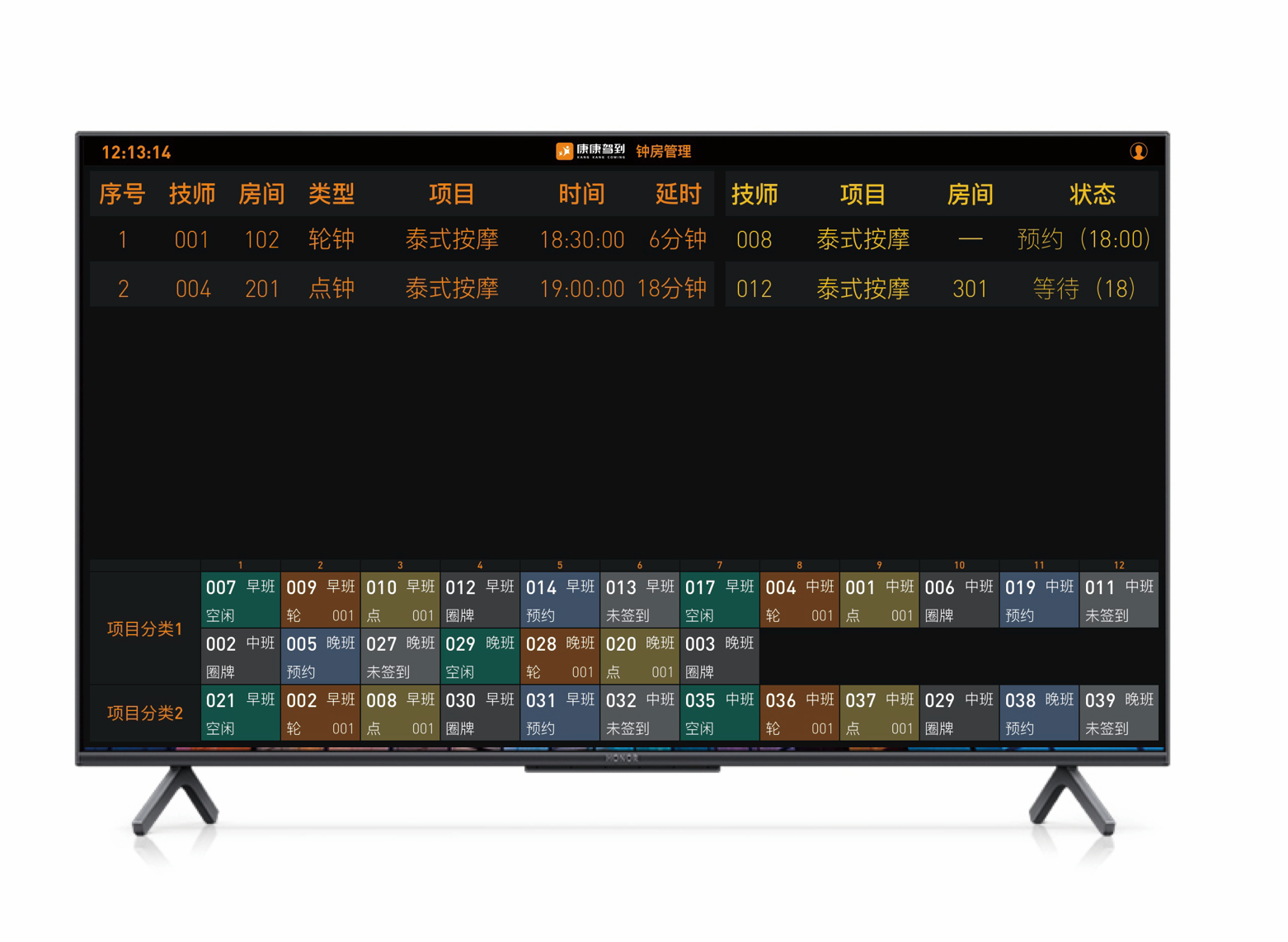 供技师使用,在钟房显示屏上显示排钟、预约、等待信息。只需显示器,节省传统主机设备。