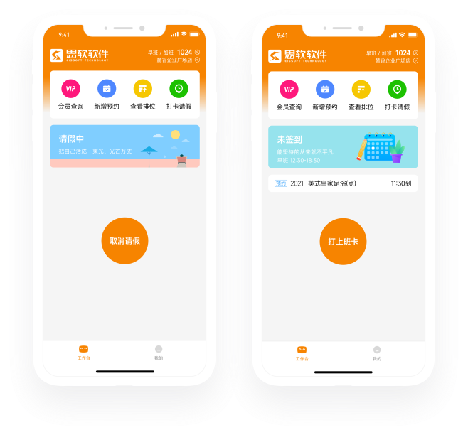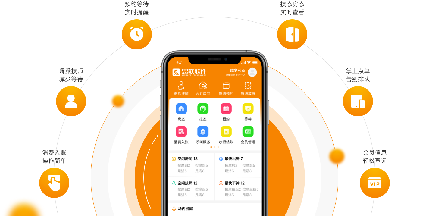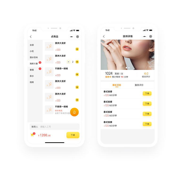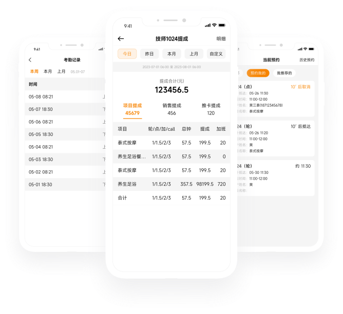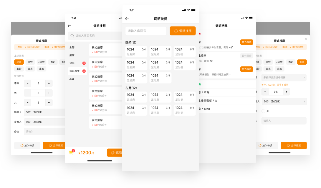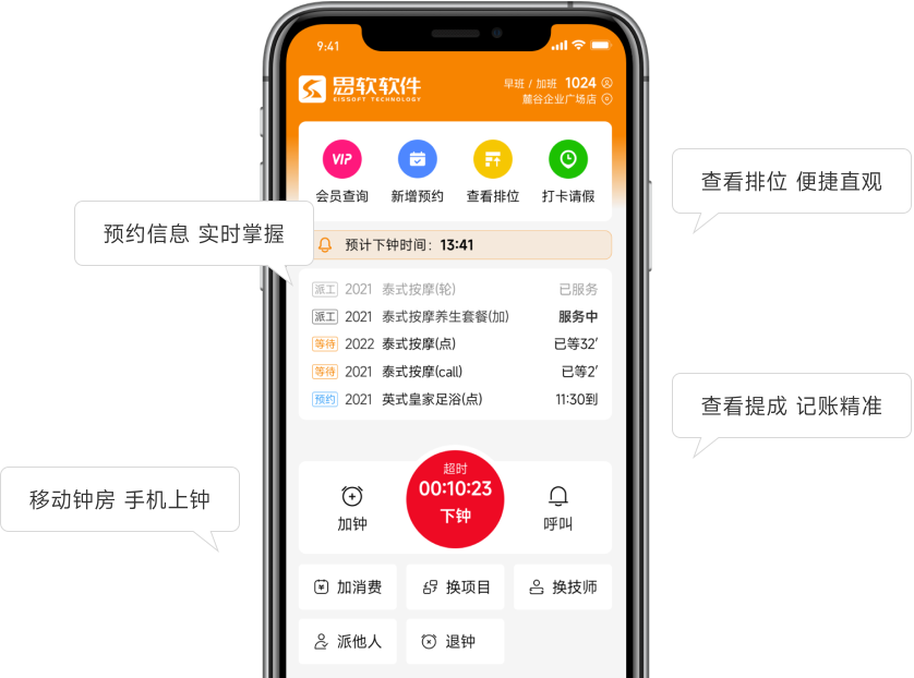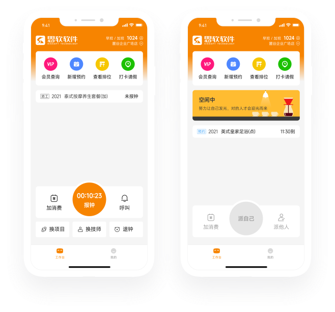 技师报钟后进入工作状态,可以帮助客人更换项目、加钟、呼叫服务。技师下钟后进入听单状态。