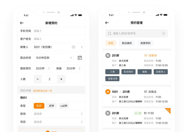 客人到店后,技师空闲,点击‘入客’按钮直接安排,快捷方便。