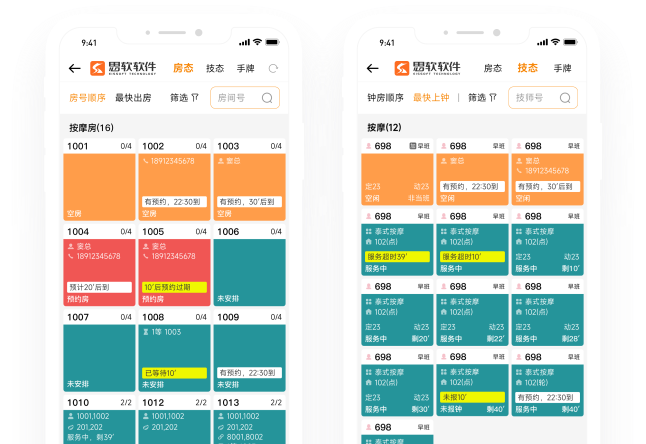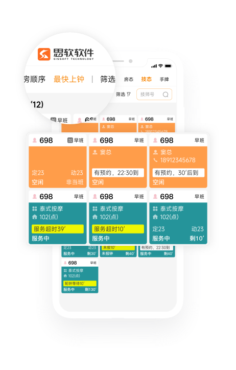 显示每位技师状态,分时间筛查技师下钟时间,例如:还有5分钟下钟,还有10分钟下钟,让客人等的安心